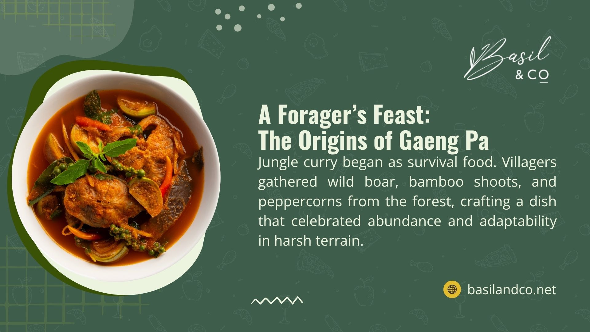 They took whatever they could forage from the forest – wild boar, fresh herbs, peppercorns still on the vine – and threw it all into a pot with some serious chiles. The name Gaeng Pa literally means “forest curry” because traditional versions pack in more than 15 different plants and herbs from the jungle.